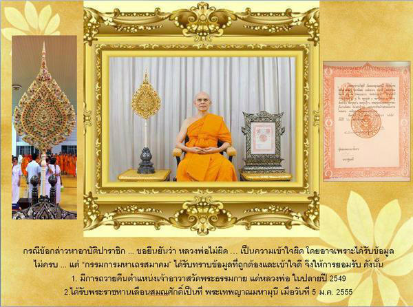 ปล. ล่าสุดเมื่อไม่กี่เดือนก่อนปลายปี ๒๕๔๙ ทางคณะกรรมการมหาเถรสมาคม ได้ส่งผู้แทนเดินทางมายังวัดพระธรรมกาย เพื่อถวายตำแหน่งเจ้าอาวาสวัดพระธรรมกาย คืนแด่พระราชภาวนาวิสุทธิ์ ท่ามกลางสักขีพยานทั้งพระภิกษุ สามเณร อุบาสก อบาสิกา ญาติโยม ที่มาอนุโมทนาบุญนับพันท่าน รวมถึงคณะพระเถระเจ้าคณะพระสังฆาธการจากวัดอื่นๆมาร่วมเป็นสักขีพยานอีกจำนวนมาก