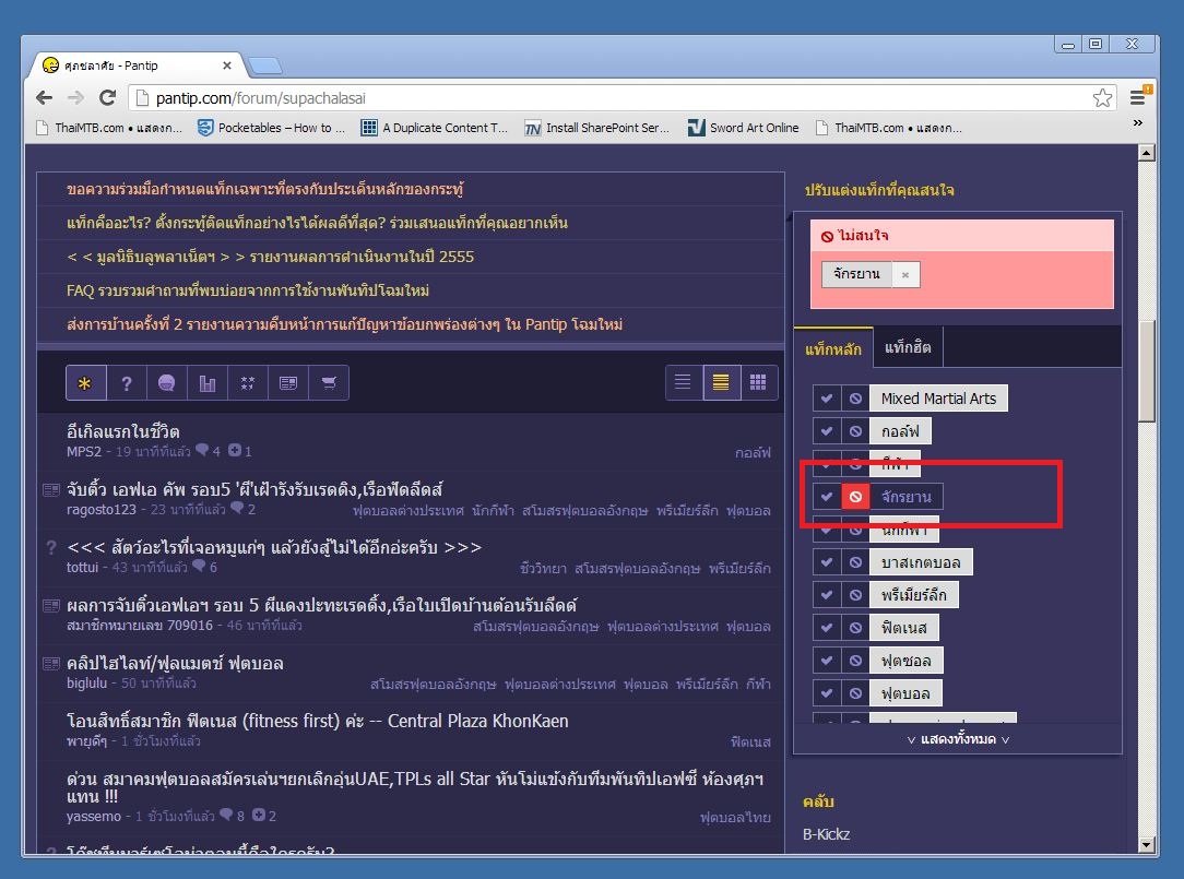 ถ้าท่านไม่ต้องการเหนกระทู้จักรยานให่รถหูรกตา ท่านสามารถแก้ปัญหาได้ภายในคลิ๊กเดียว แค่คลิ๊ก "ไม่สนใจแท๊กนี้" ที่หน้าแท๊กจักรยานทางขวามือของหน้าจอ ท่านก้อจะกำจัดกระทู้จักรยานออกไปจากหน้าจอของท่านได้แล้วครับ