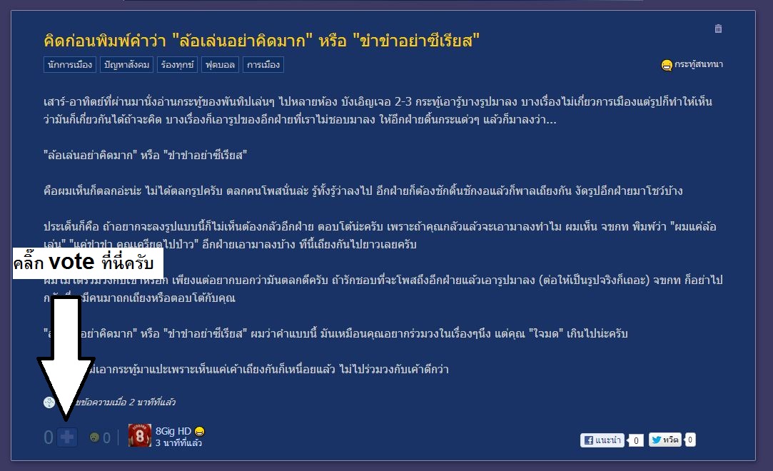 ส่วนเรื่องกระทู้แนะนำ ถ้าท่านไม่อยากให้กระทู้จักรยานขึ้นแนะนำ รบกวนช่วยกันโหวตกระทู้บอลที่ท่านชื่นชอบ ให้ขึ้นแนะนำด้วยครับ ถ้าท่านไม่โหวตกระทู้ก้อไม่ขึ้นครับ