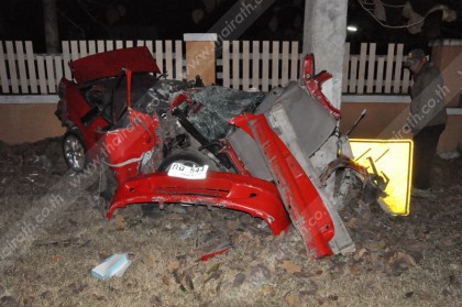 จุดเกิดเหตุอยู่บนถนนพหลโยธิน บริเวณเชิงสะพานริมแม่น้ำกก ฝั่งขาเข้าเมือง ที่หน้าสำนักงานแขวงการทางเชียงราย พบรถยนต์เก๋งยี่ห้อฮุนได สีแดง ทะเบียน กฉ 544 เชียงราย พุ่งชนเสาไฟฟ้าแรงสูง ติดหน้ารั้วสำนักงานแขวงการทางเชียงราย ในสภาพพังยับเยิน หลังคาเปิด ตัวถังรถหักพับงอ หน้ารถย่น เครื่องยนต์อัดเข้าห้องโดยสารอัดก๊อบปี้ร่างของนายนรพัทธิ์ บุญปลื้ม อายุ 21 ปี อยู่บ้านเลขที่ 68 หมู่ 1 ต.จรเข้ใหญ่ อ.บางปลาม้า จ.สุพรรณบุรี คนขับรถคันดังกล่าว และนายอนุชาติ วรพันธ์ อายุ 20 ปี อยู่บ้านเลขที่ 109 หมู่ 5 บ.สันต้นเปา ต.รอบเวียง อ.เมือง จ.เชียงราย นั่งเบาะหน้าคู่กันมาตายคาที่ ส่วนนายคฑาวุธ สุวรรณหงส์ อายุ 22 ปี อยู่ บ.สันต้นปา ต.รอบเวียง อ.เมือง จ.เชียงราย นั่งที่เบาะหลัง ได้เสียชีวิตในเวลาต่อมา