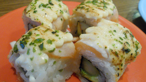 ซูชิจะเป็นแบบสายพาน จานแต่ละสีราคาต่างกันไป มีราคาแปะไว้ทุกโต๊ะ