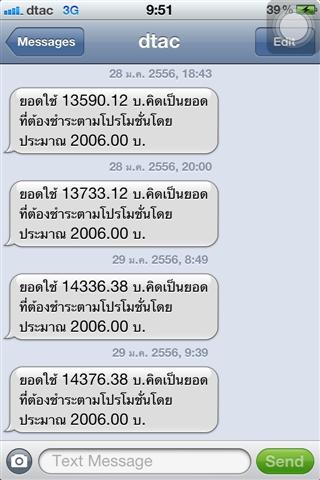 แต่เมื่อคืนที่ผ่านมา มี SMS มาแจ้งว่ายอดการใช้งานของผม 14376.38 บาท ที่ต้องชำระตามโปรโมชั่น 2006.00 บาท