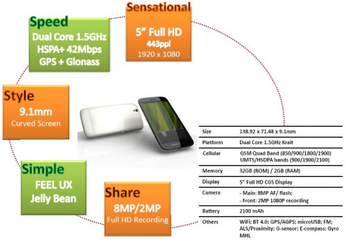 ส่วน Spec อื่นๆก็คือมาพร้อมกล้องความละเอียด 8 ล้านพิกเซลพร้อม AF และ LED Flash ด้วยรูรับแสง f/2.0, เลนส์ wide 28mm และมี BSI Sensor (ถ่ายวีดีโอสูงสุด 720p) ส่วนกล้องหน้า 1.3 ล้านพิกเซล, รองรับ 3G คลื่น 900/2100MHz, CPU MediaTek MT6577 dual-core 1.2GHz (Cortex-A9), GPU PowerVR SGX531T, RAM 1GB, หน่วยความจำภายใน 4GB (เพิ่ม microSD Card ได้สูงสุด 32GB), แบตเตอรี่ขนาด 1900 mAh และมาพร้อมกับ Android 4.0 ICS ทั้งหมดนี้ราคา 12,900 บาท