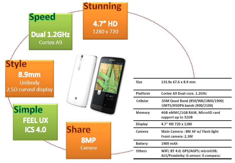 ส่วน Spec อื่นๆก็คือมาพร้อมกล้องความละเอียด 8 ล้านพิกเซลพร้อม AF และ LED Flash มีฟังก์ชัน HDR, Smile Detection และ Burst shot ส่วนกล้องหน้าความละเอียดระดับ VGA, รองรับ 3G คลื่น 900/2100MHz, CPU MediaTek MT6577 dual-core 1.0GHz (Cortex-A9), GPU PowerVR SGX531T, RAM 512MB, หน่วยความจำภายใน 4GB (เพิ่ม microSD Card ได้สูงสุด 32GB), แบตเตอรี่ขนาด 1650 mAh และมาพร้อมกับ Android 4.0 ICS ทั้งหมดนี้ราคา 9,450 บาท