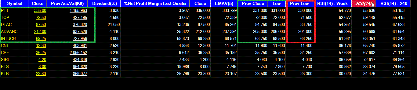 ระบบ Scan หุ้น อิง พื้นฐาน + สัญญาณทางเทคนิค + Price ราคา ซื้อ ตรง เหลืองๆ แดงๆ = Prev Close // Low // Prev low ADVANC // EGCO