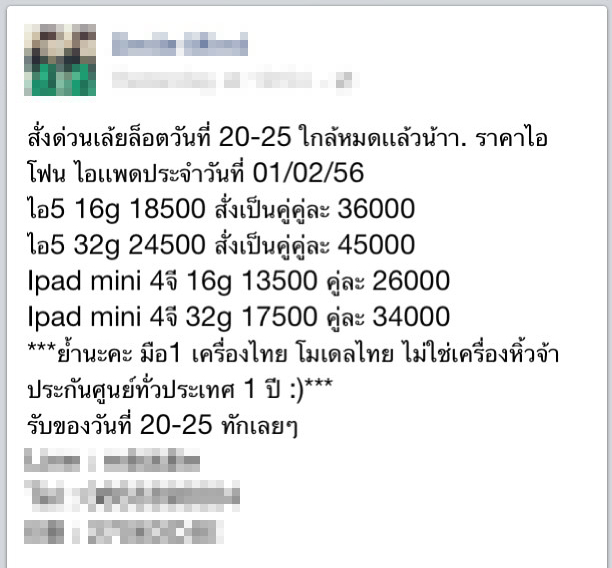 อีกอย่างที่โพสขายนี้ยังต้องโอนเงินไปก่อนแล้วรับของทีหลังด้วย ยิ่งมีความเป็นไปได้สูงว่าจะโดนหลอก หรือไม่แน่ว่าคนที่ตั้ง Status นี้ขึ้นมาอาจจะโดนหลอกมาอีกชั้นหนึ่งก็เป็นไปได้ เพราะโพสเบอร์ โพส Line โพส BB อย่างชัดเจน