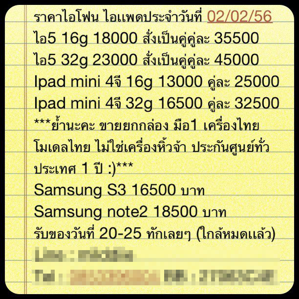 พอดีผมบังเอิญเจอใน Facebook เลย Capture มาให้ดู แต่โดยส่วนตัวคิดว่าราคา iPhone 5, iPad mini ของมือหนึ่งที่โพสเอาไว้นั้นเป็นไปไม่ได้แน่นอน ไม่ว่าจะเป็นเครื่องนอกหรือเครื่องศูนย์ก็ตามที