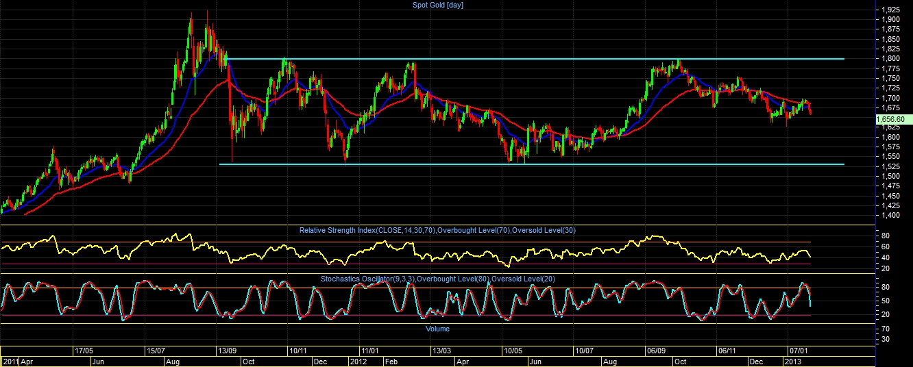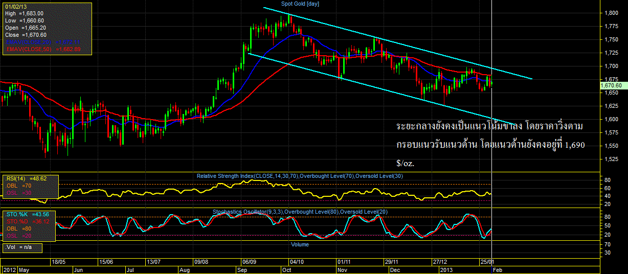 ในระยะเวลา 2 ปี แนวโน้มยังคงเป็น Sideway หรือ ยังไร้แนวโน้มอยู่โดยแนวรับแนวต้านอยู่ระหว่าง 1,520-1,800 $/oz.