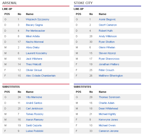 Arsenal: Szczesny; Sagna, Mertesacker, Koscielny, Monreal; Diaby, Arteta, Wilshere; Oxlade-Chamberlain, Walcott, Giroud