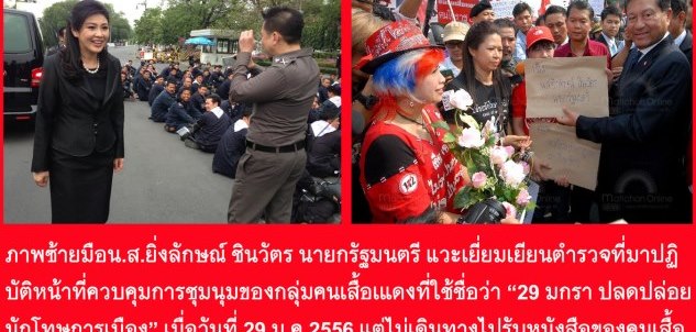 แดงอำมาตย์โชว์ศักยภาพ เปิดโรงเรียนถล่มแดง 29 มกราฯ ยับ "เหวง" ติดหนวด สั่งพวกจะสถาปนาตัวเองเป็นแกนนำแดงแข่งหุบปาก โทษฐานเอาท่าทีศัตรูมาใช้กับมิตร เอาปืนมายิง เอาหอกมาแทงพวกเดียวกันเองเท่ากับเป็นพวกประชาธิปัตย์ แก้ตัวอ้างเพื่อไทยไม่ได้เหยียบศพคนเสื้อแดง เคาะกะลาลั่นเวที อยากให้ผู้ใหญ่กลับบ้านต้องประคับประคองรัฐบาล "ธิดา" ไปไกล อำมาตย์คือพวกบังคับให้เด็กตัดผมเกรียนและยังสมคบกับต่างชาติ
