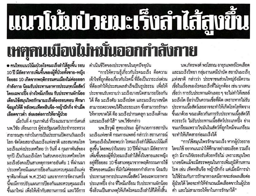 แนวโน้มป่วยมะเร็งลำไส้สูงขึ้นเหตุคนเมืองไม่หมั่นออกกำลังกาย