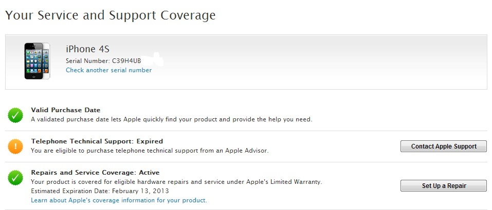 ลองเช็คประกันในเว็บ Apple ยังมีประกันเหลือถึง 13/2/2013