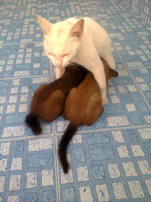 เมื่อปลายปีที่แล้ว น้องสาวไปช่วยแมวมาจากชุมชนแถวสาทร พอไปถึงแล้วเห็นแมวกินน้ำครำ (สยอง) เลยเอามาทั้งแม่ทั้งลูก สรุปว่าได้แม่แมว 1 ลูกอีก 3 (ตอนนี้ตายไป 1) แมวใหญ่อีก 2 ตอนนี้มีตัวน้อยเพิ่มมาอีก 2 ตั