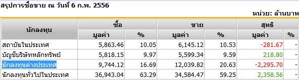 สรุปการซื้อขาย ณ วันที่ 6 ก.พ. 2556