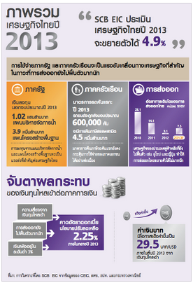 ศูนย์วิจัยไทยพาณิชย์เผยแพร่เอกสาร Economic Outlook 1/2013 โดยมองว่า เศรษฐกิจไทยจะขยายตัวได้ 4.9% จากแรงขับดันของภาครัฐและภาคครัวเรือน ขณะที่การส่งออกจะยังไม่ฟื้นตัวมากนัก รวมทั้งมองว่าอัตราดอกเบี้ยจะลดลงและค่าเงินบาทจะแข็งขึ้นด้วย