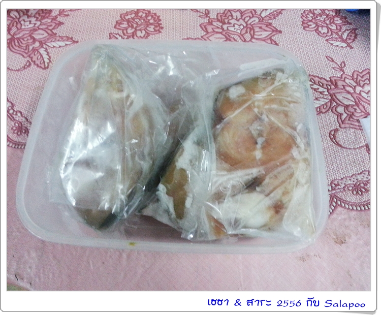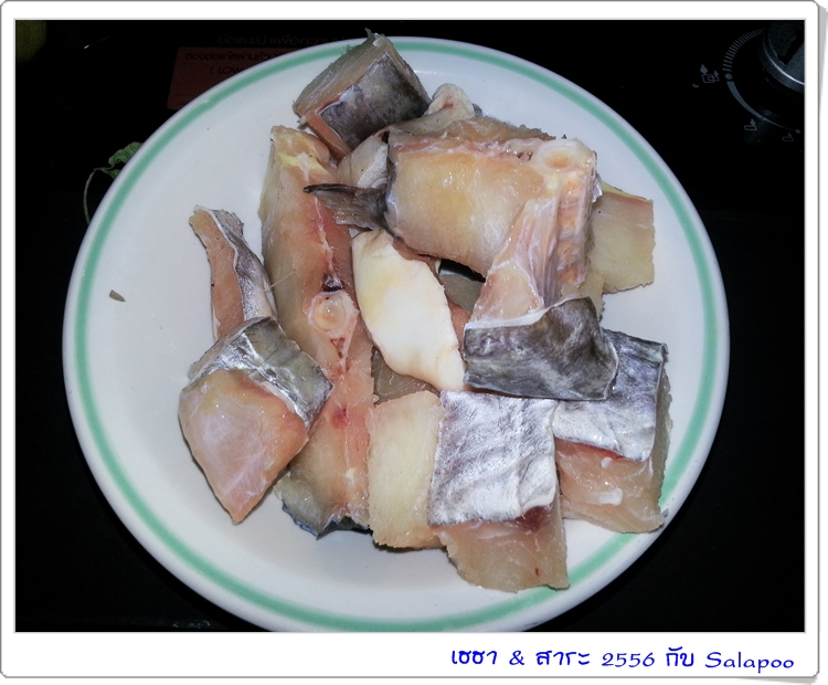 ปลาหายแข็งแล้ว เอามาหั่นเป็นชิ้น ๆ เตรียมไว้