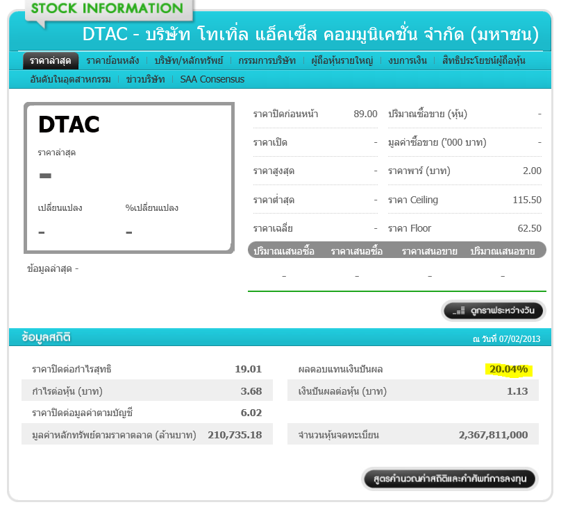 แต่ผมไปดูเงินปันผลของปี 2012 มันรวมๆ แค่ 5% กว่าเอง ที่ราคาหุ้นหน่วยละ 89 บาท