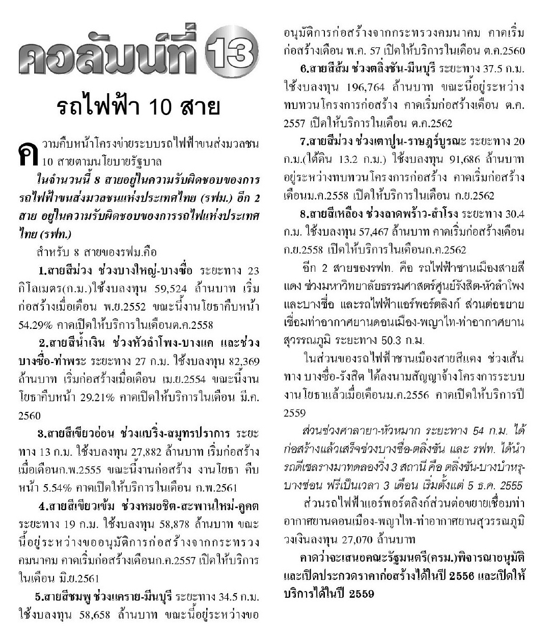ความคืบหน้าโครงข่ายระบบรถไฟฟ้าขนส่งมวลชน 10 สาย ตามนโยบายรัฐบาล