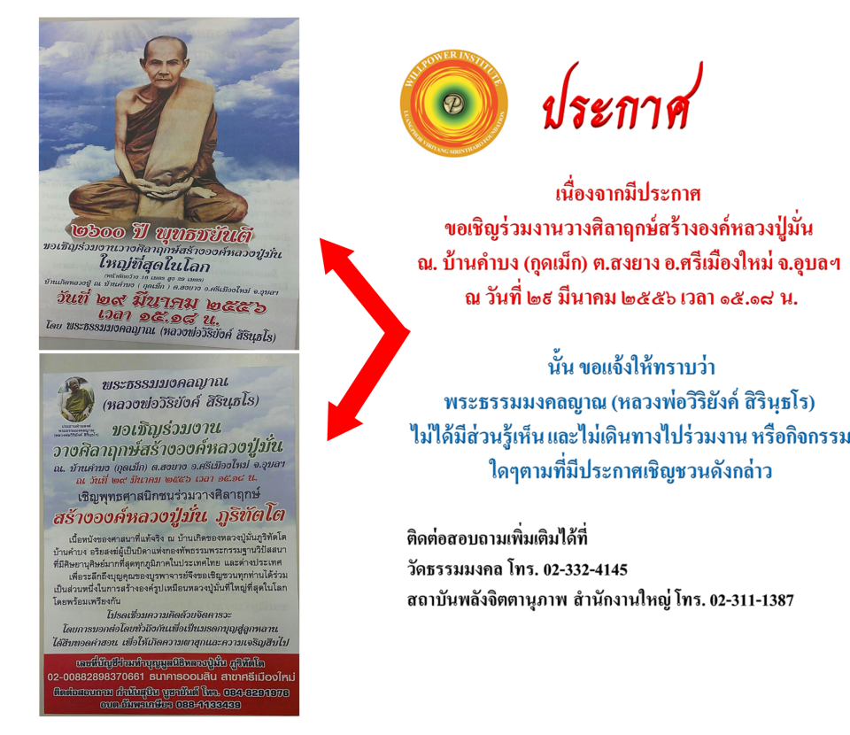 ประกาศจากหลวงพ่อวิริยังค์ ไม่เกี่ยวข้องกับการสร้างองค์หลวงปู่มั่นที่ จ.อุบลราชธานี