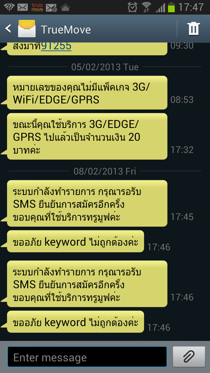 http://pantip.com/topic/31076847/comment11 http://pantip.com/topic/31076847/comment12 แจ้งเบอร์ที่ส่ง sms ขยะมา และรหัส USSD ที่มีลักษณะหลอกลวงให้กดสมัครบริการ
