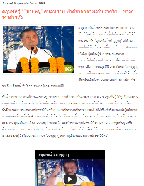 หลังจากเกิดเป็นกระแสฮือฮา สร้างเสียงวิพากษ์วิจารณ์ในโลกอินเทอร์เน็ตอยู่ในขณะนี้ เกี่ยวกับคลิป ม.ร.ว.สุขุมพันธุ์ บริพัตร ผู้สมัครรับเลือกตั้งผู้ว่า กทม จากพรรคประชาธิปัตย์ สบถบนเวทีปราศรัย เนื่องจากไม่