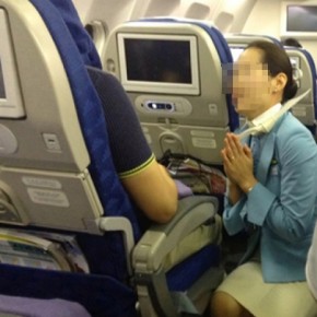 เมื่อไม่นานมานี้ ได้ยินข่าวเกี่ยวกับแอร์โฮสเตสสาว ที่ได้ทำน้ำกระฉอกใส่ผู้โดยสารท่านหนึ่ง เนื่องจากเครื่องบินค่อนข้างโยกไหวจากคลื่นลมแรง และถึงแม้ว่าเธอจะเอาผ้าเช็ดหน้าซับน้ำให้แล้ว แต่ผู้โดยสารก็ยังโกรธจัด ต้องการคุยกับหัวหน้าพนักงานบนเครื่อง ในที่สุด แอร์โฮสเตสสาวก็คุกเข่าและพนมมือไหว้ขอโทษผู้โดยสารชายคนดังกล่าว เขาจึงคลายความโกรธลงและไม่เอาเรื่องต่อ