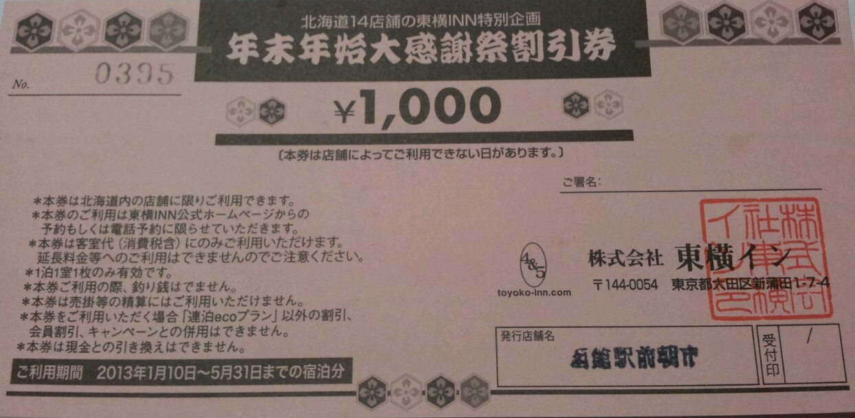พอดีว่าไปพักที่ toyoko inn สาขา hakodate มาค่ะ และจนท.โรงแรมก็ให้บัตรส่วนลดมา 2 ใบ