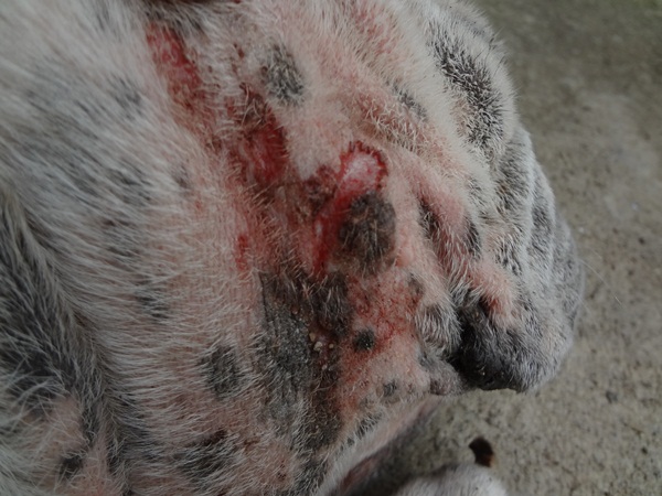 คือหมาบูลด๊อกที่บ้าน ก็รักษาโรคผิวหนังไปเรื่อยครับ ตามโอกาส ที่ผมเข้าในตัวจังหวัด (ผมอยู่อำเภอนอกๆ กันดาร) ก็มีอาบน้ำด้วยยารักษาโรคผิวหนัง.. กลิ่นตัวหายไปแต่ก็มีแผลตามตัวขึ้นมาใหม่