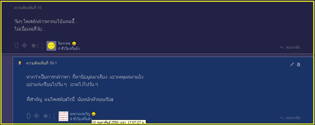 http://pantip.com/topic/32881721/comment68 นึกว่าจะมีโต้มาจั๊กดอกสองดอก กลับมิดอิ่มสิ่มป่านอมสาก เป่าดากก็บ่ตีงคีง เลยมาตั้งทู้ระบายเซ็ง แต่วันนี้ขอแค่ระบายเซ็งเสย ๆ ใครสนใจ ลงชื่อไว้เลย พรึ่งนี