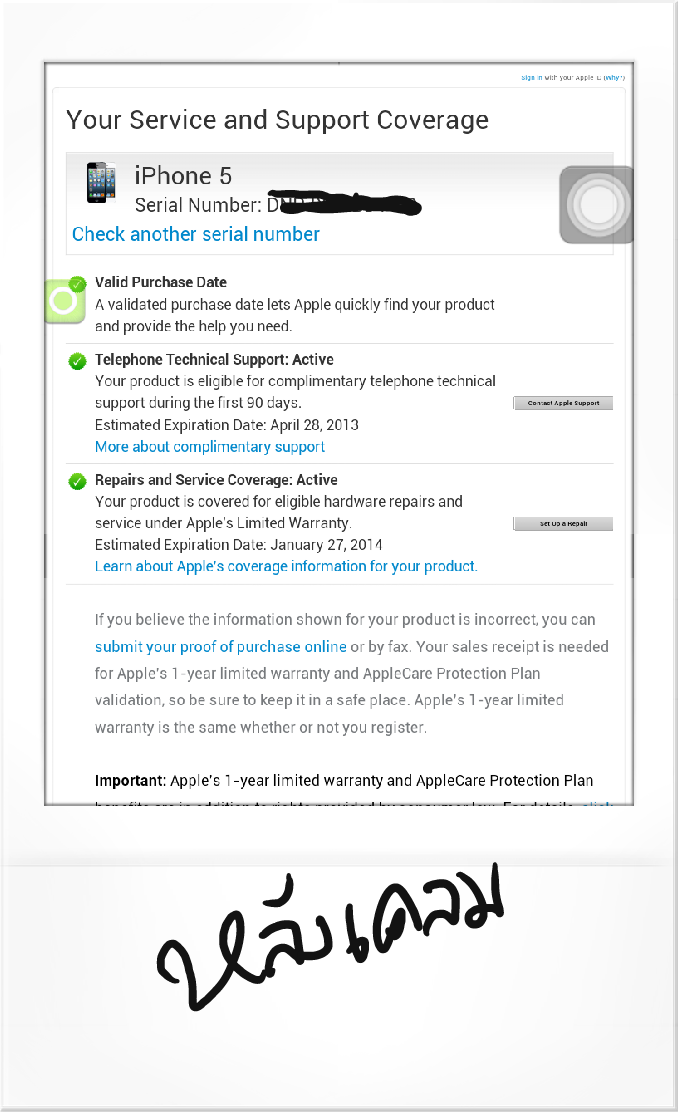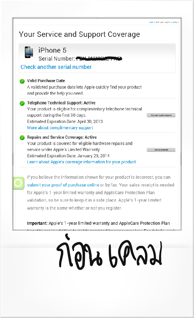 ก้ได้เครื่องเกือบจะเพอเฟค<มีรอยสีลอกที่ปุ่มลดเสียงนิดหน่อยแต่รับได้> ได้เครื่องกลับบ้านอย่างมีความสุข แต่เอ้ะ!! เอะใจเอา serial numberเครื่องใหม่ที่เพิ่งได้มาไปเชคกับแอปเปิล.........ปรากฎว่าประกันหายไป2วัน