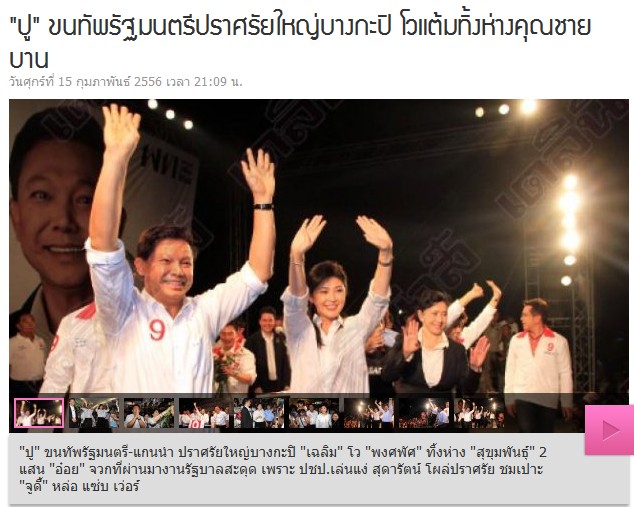"ปู" ขนทัพรัฐมนตรี-แกนนำ ปราศรัยใหญ่บางกะปิ "เฉลิม" โว "พงศพัศ" ทิ้งห่าง "สุขุมพันธุ์" 2 แสน "อ๋อย" จวกที่ผ่านมางานรัฐบาลสะดุด เพราะ ปชป.เล่นแง่ สุดารัตน์ โผล่ปราศรัย ชมเปาะ "จูดี้" หล่อ แซ่บ เว่อร์