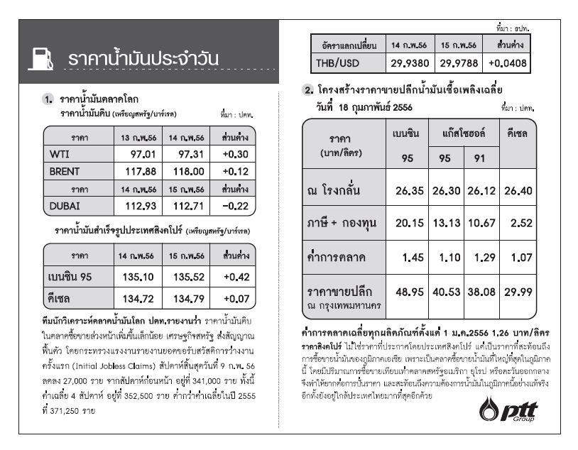 อัพเดทราคาน้ำมันประจำวันที่ 18 กุมภาพันธ์ 2556