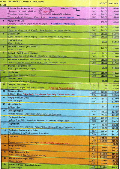 เอาราคา Agent ขายตั๋วสถานที่ท่องเที่ยวต่างๆ ในสิงคโปร์ มาฝากค่ะ นอกเหนือจาก Sea Wheel เจ้าดังย่านไชน่าทาวน์แล้ว ยังมีอีกเจ้า ที่ราคาน่าคบหาค่ะ Travel Delight แห่งย่านบูกิส pricelist ตามตารางข้างล่างเ