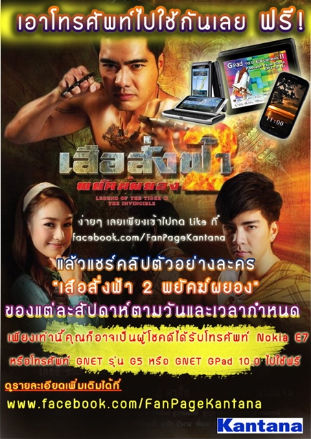 เพียงทำตามกติกาง่ายมาก ๆ แค่เข้าไปกด Like ที่ www.facebook.com/FanPageKantana แล้วแชร์คลิปตัวอย่างละคร "เสือสั่งฟ้า 2 พยัคฆ์ผยอง" ของแต่ละสัปดาห์ ตามวันและเวลาที่กำหนด เพียงเท่านี้คุณก็อาจเป็นผู้โชคดีได้รับโทรศัพท์ Nokia E7 หรือโทรศัพท์ GNET รุ่น G5 หรือ GNET GPad 10.0 ไปใช้กันเลย..ฟรี