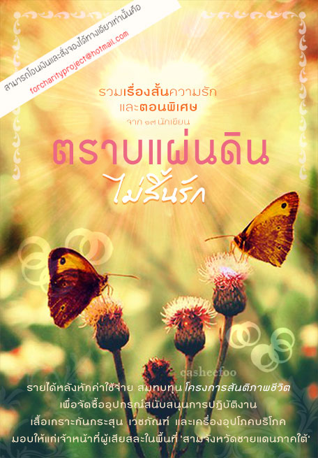 โดยตอนพิเศษนี้ ตั้งใจเขียนขึ้นเพื่อทำโครงการร่วมกันเพื่อนๆพี่ๆน้องๆนักเขียนอีก 16 ท่าน (เรื่องสั้นความรักจากนามปากกา น้ำฟ้า แม่ช้อง เนตรนภัส ดังปัณณ์ ดวงมาลย์ ณิชนิตา ภาวิน ชมบุหลัน และมารีอา ตอนพิเศษจากเรื่อง หัวใจร้ายๆพ่ายรัก(ภาพิมล) มายากรแห่งรัก(อสิตา) จูบเย้ยจันทร์(นณกร) หวานรักในลมร้อน(แสนดี) ร้อยรักล้อมใจ(nanaspace) Desperado อาชญากรยอดรัก(ฟองคลื่น คืนจันทร์ พันดาว) แสงตะวันส่องใจ(พรรณสิริ) และหอมกลิ่นโบตั๋น(ญาณภา)) หารายได้สมทบทุนโครงการสันติภาพชีวิต เพื่อจัดซื้ออุปกรณ์สนับสนุนการปฏิบัติงาน เสื้อเกราะกันกระสุน เวชภัณฑ์ และเครื่องอุปโภคบริโภค มอบให้แก่เจ้าหน้าที่ผู้เสียสละในพื้นที่ ‘สามจังหวัดชายแดนภาคใต้’ ค่ะ (มีตัวอย่างบางเรื่องลงไว้ที่