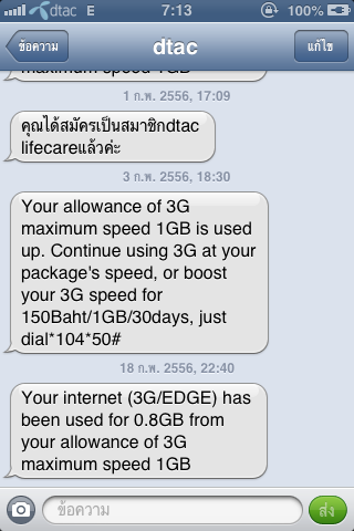 ต่อมาได้รับ sms ตอน 22.40 น. บอกผมใช้เน็ตไปแล้ว 0.8 GB
