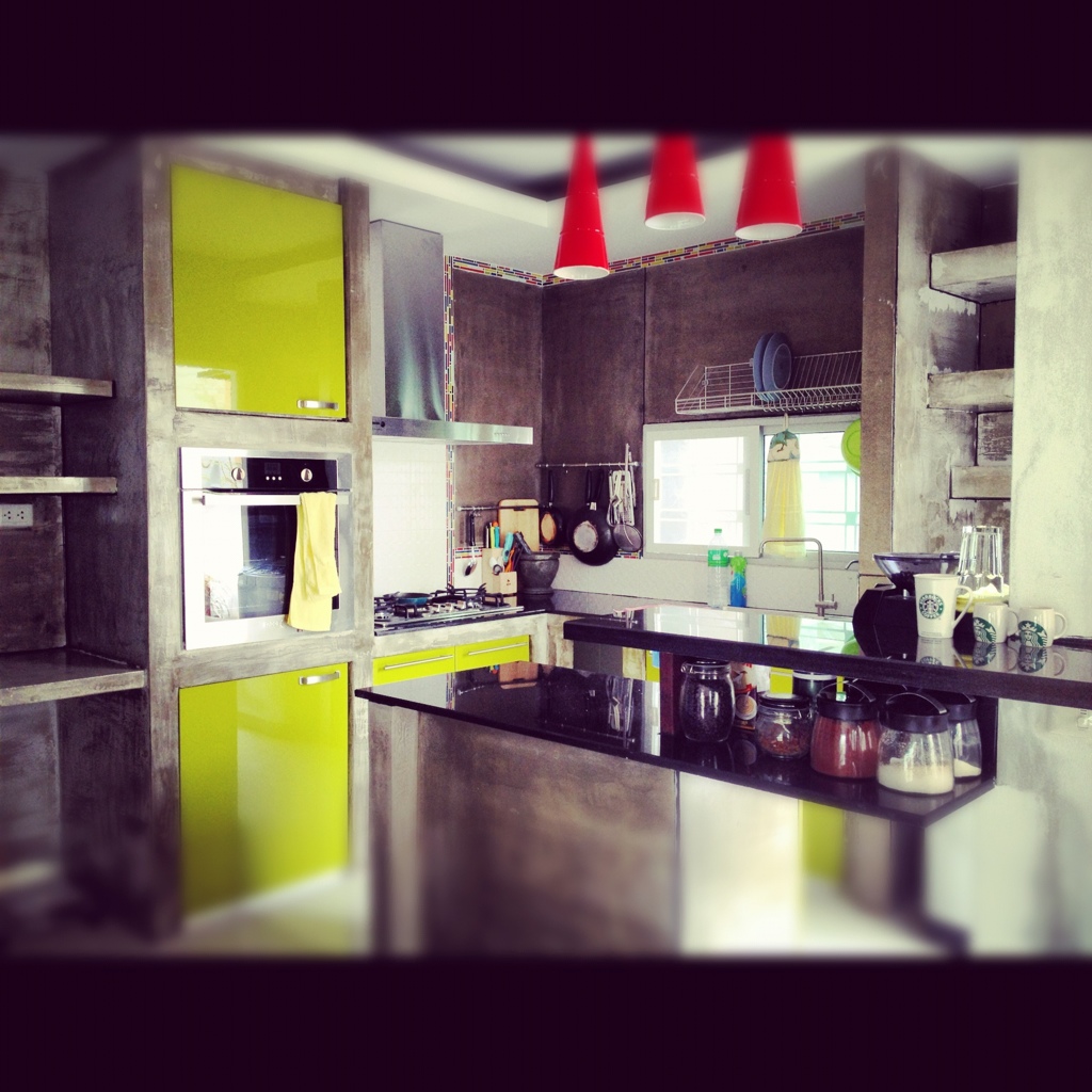ที่บ้านเป็นทาวน์โฮม 2 ชั้น แต่หลังบ้านได้มาเยอะ เลยต่อครัวเพิ่มค่ะ เราเลือกทำพื้นปูนเปลือยขัดมัน เค้าน์เตอร์ครัวปูนเปลือยขัดมัน เราชอบสีสว่างๆ ต้องการให้ห้องครัวไม่อับทึบอึดอัด เลยไม่ทาสีปูนที่เค