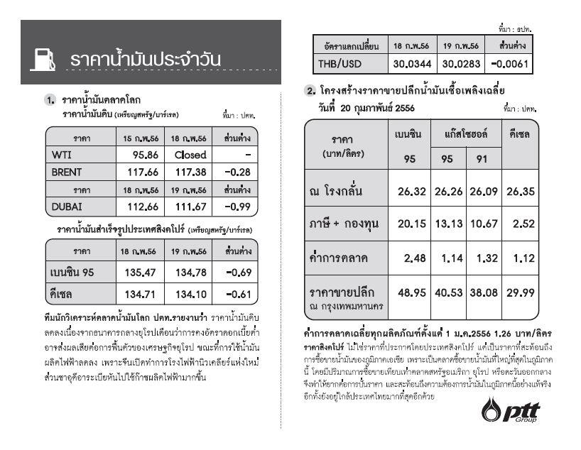 อัพเดทราคาน้ำมันประจำวันที่ 20 กุมภาพันธ์ 2556