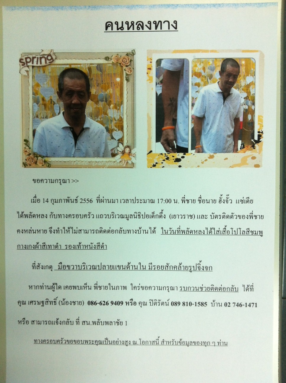 รบกวน เพื่อนๆ พี่ๆ ชาว Pantip ช่วยส่งข้อมูลนี้ต่อให้ที่คะ พี่ชายพลัดหลง หายไปหลายวันแล้ว ทางบ้านเป็นห่วงมากๆ คะ