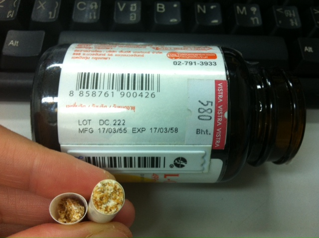 ไม่แน่ใจว่าเสียหรือยังน่ะค่ะ รู้สึกมันแปลกๆ แบบว่าไม่ค่อยจะสังเกต จับยามายัดเข้าปากเลย -_-" มาวันนี้เห็นแล้วแอบตกใจ แถมจำไม่ได้ว่าตอนซื้อมาแรกๆหน้าตามมันขาวจั๊วะ หรือว่าเป็นแบบในรูป แต่แอบเสียดายง่ะ ยังไม่หมดอายุเลย (ฉลากยัง แต่ตัวยาไปแล้วเปล่าเนี่ย)
