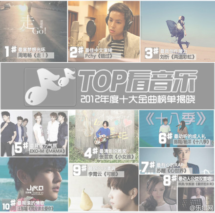 10 อันดับเพลงจีนยอดนิยมปี 2012 ของเว็บไซต์ myctop.com (เปิดให้มีการโหวตตั้งแต่ปลายปีที่ผ่านมา ประกาศผลทางเว็บไซต์วันนี้)