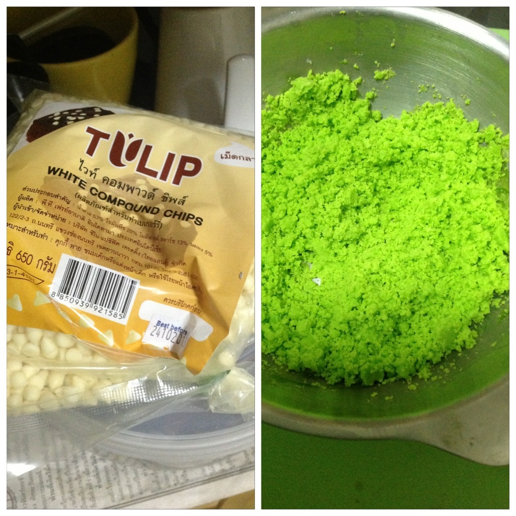 แต่พอใส่สีผสมอาหารแบบเป็นขวดน้ำลงไป ก็ดูร่วนๆ ไม่เกาะตัว บี้ๆนิดหน่อยก็เป็นผงแล้ว