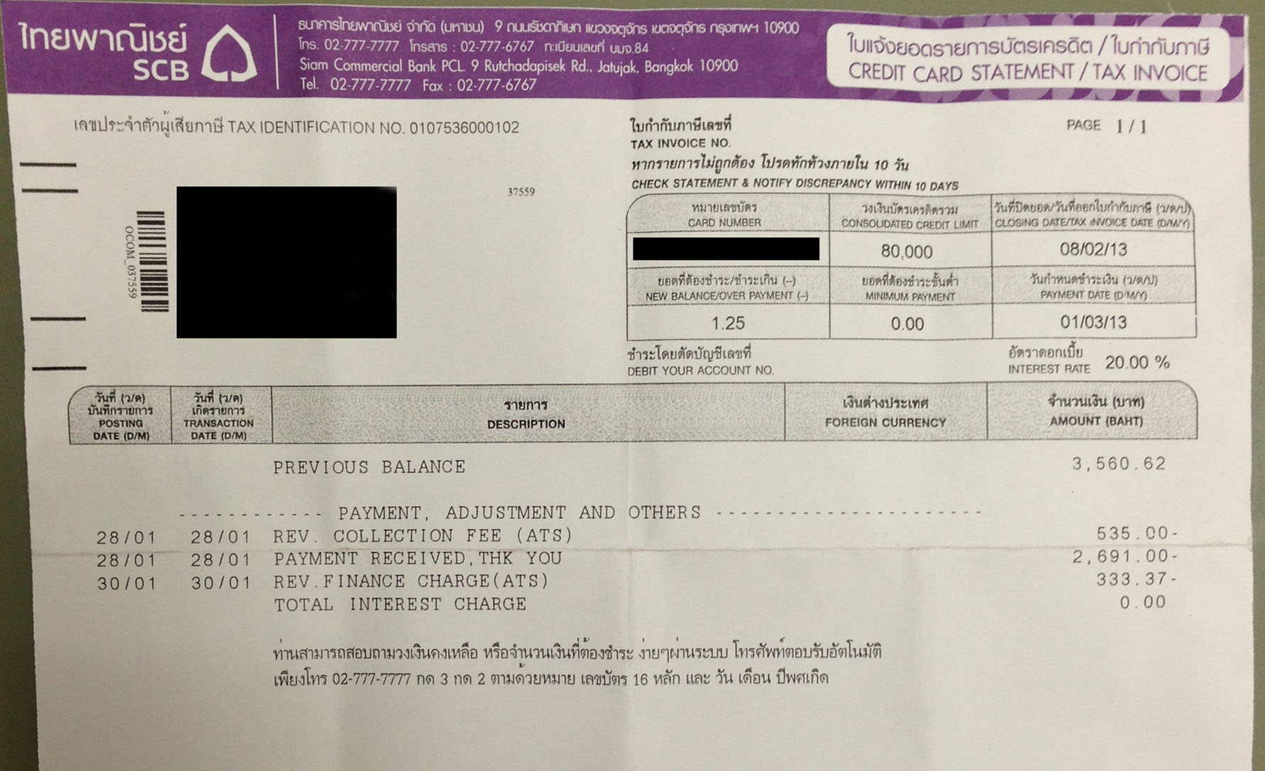 จากกระทู้ http://pantip.com/topic/30059114 จริงๆ มีอีกกระทู้ แต่ จำโพสไม่ได้ เลยขอเล่าย้อนหลังนิดนึง มียอดค้างชำระเข้ามา 1.25 บาท ซึ่งจริงๆ แจ้งปิดบัตรไปหมดแล้ว เพราะไม่พึงพอใจในการบริการของธนาคาร