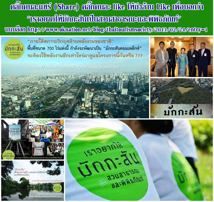 คลิ๊กคนละแชร์ (Share) คลิ๊กคนละ like ให้ถึงล้าน Like เพื่อบอกว่า "เราอยากให้มักกะสันเป็นสวนสาธารณะและพิพิธภัณฑ์"