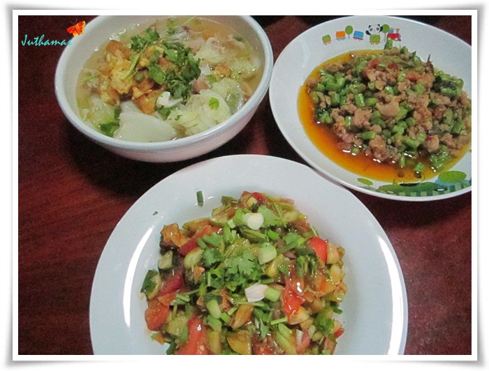 เมนูวันนี้ 1. ผัดกระเพราหมูสับใส่ถั่วฝักยาว 2. ต้มจืดไข่ลอยน้ำ (พ่อครัวตัวดีตั้งชื่อให้) 3. ยำปลากระป๋อง