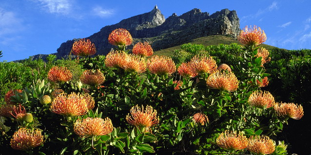 ภูเขาโต๊ะ (Table Mountain) ที่มีลักษณะยอดตัดขวางเรียบ แลดูเหมือนโต๊ะ อยู่ติดกับ Devil’s Peak มีความสูง3,563 ฟุต ภูเขาโต๊ะเป็นภูมิศาสตร์ที่มีชื่อเสียงของเมืองเคปทาวน์ รูปของภูเขาโต๊ะจึงปรากฎอยู่บนธงประจำเมือง บริเวณภูเขาโต๊ะมีพืชพรรณที่จัดจำพวกไว้โดยเรียกว่า Fynbos โดยชื่อเดียวกันนี้ใช้เรียกลักษณะทุ่งที่พืชจำพวกนี้ขึ้นอยู่อย่างหนาแน่นได้เช่นกัน