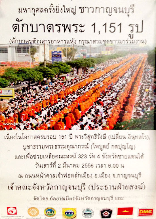 ชาวกาญจนบุรี ตักบาตรพระ 1,151 รูป เพื่อช่วยเหลือคณะสงฆ์ 323 วัด 4 จังหวัดชายแดนใต้ วันเสาร์ที่ 2 มีนาคม 2556 เวลา 06.00 น ณ ถนนหน้าศาลเจ้าพ่อหลักเมือง จ.กาญจนบุรี