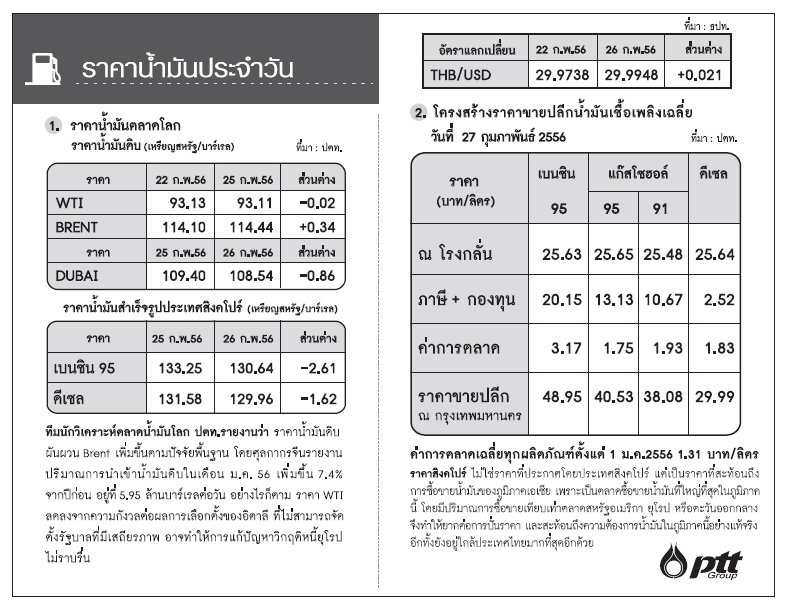 อัพเดทราคาน้ำมันประจำวันที่ 27 กุมภาพันธ์ 2556