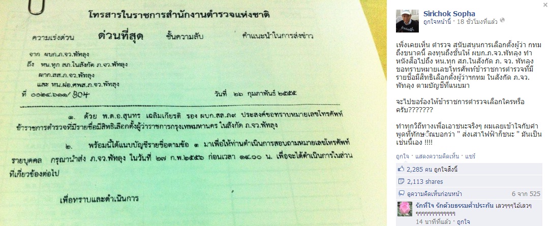 อยู่ดีดีคุณศิริโชคก็เอาหนังสือราชการตำรวจปี 2555 มาโพสในเฟสบุ๊คหาว่าเกณฑ์เอารายชื่อตำรวจ