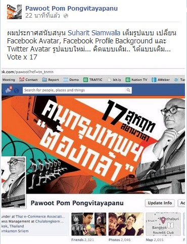ประกาศสนับสนุน Suharit Siamwalla เต็มรูปแบบ เปลี่ยน Facebook Avatar, Facebook Profile Background และ Twitter Avatar รูปแบบใหม่... คิดแบบเดิม.. ได้แบบเดิม... Vote x 17